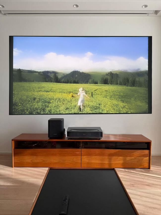 而且别担心大尺寸难安装——它机身超薄可以轻松入户,离墙20厘米就能投出完整画面,小客厅也能轻松驾驭百吋大屏。